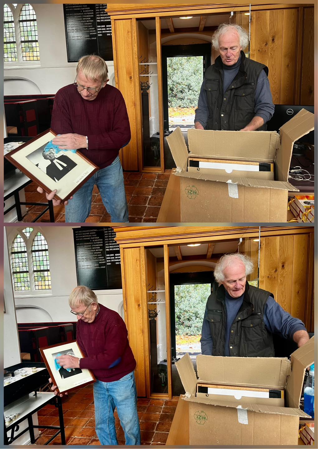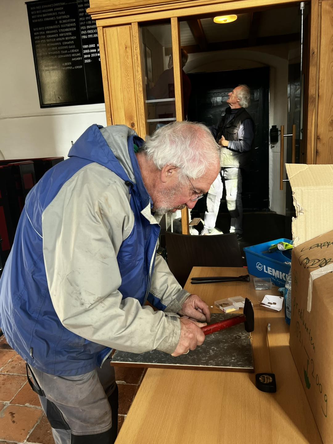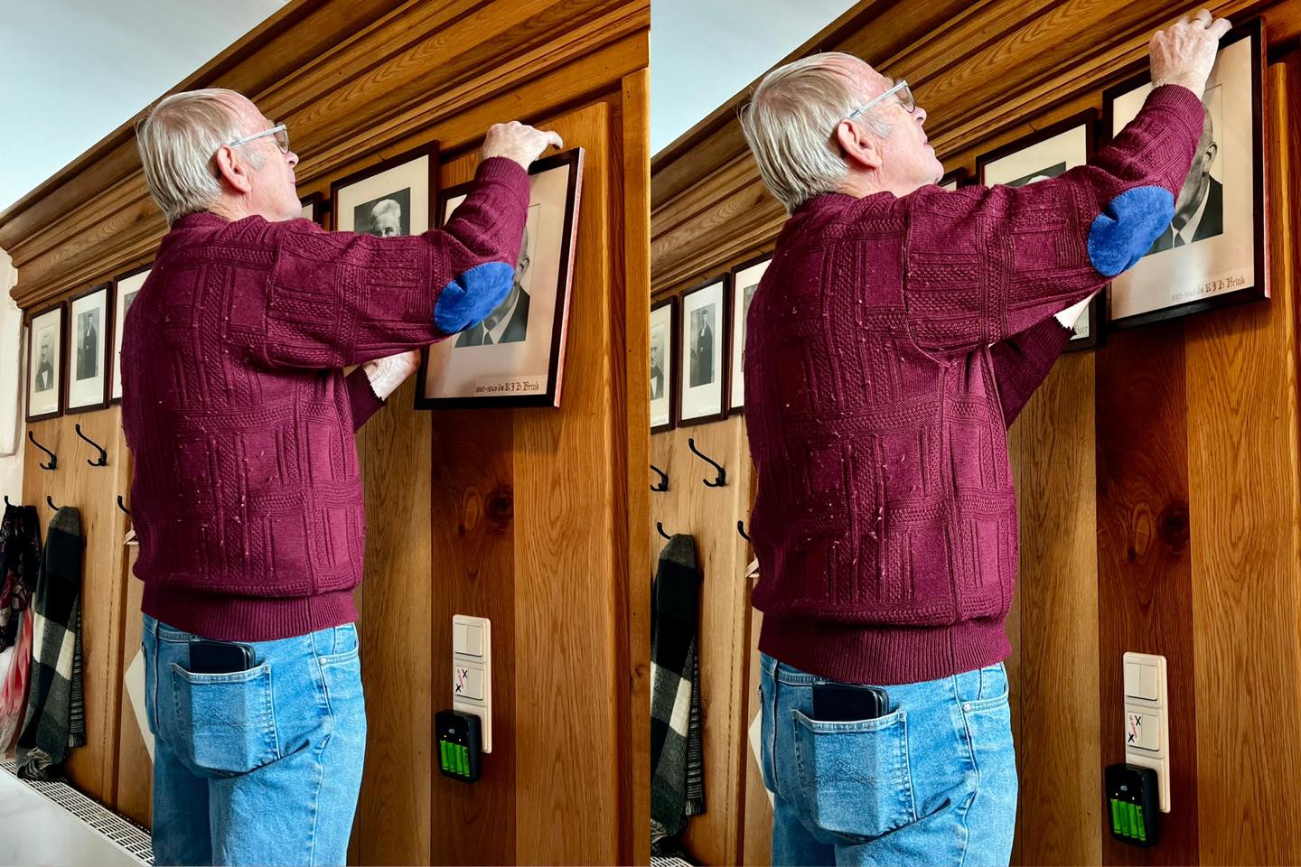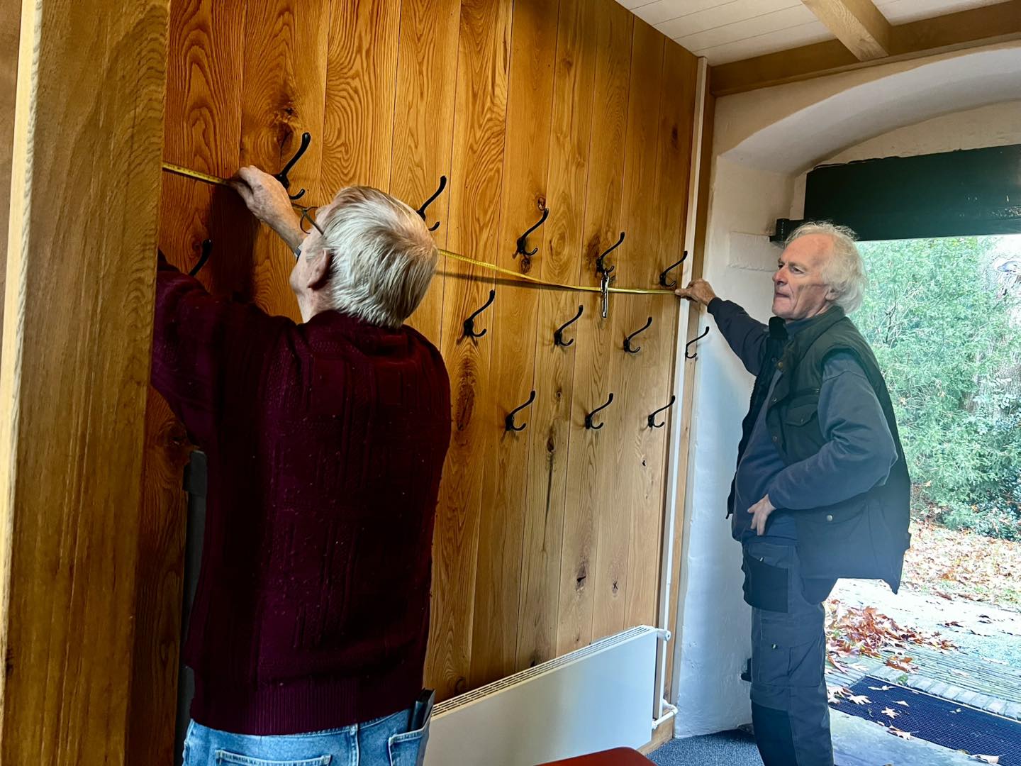 Roelof en Henk meten uit waar de foto’s precies moeten hangen.