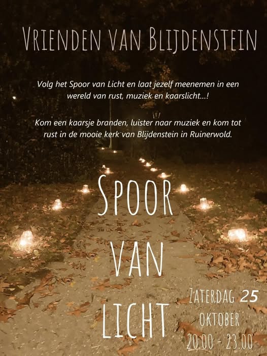 Zaterdag 25 oktober organiseert de Stichting vrienden van Blijdenstein in de Bartholomeuskerk in Blijdenstein het spoor van licht.