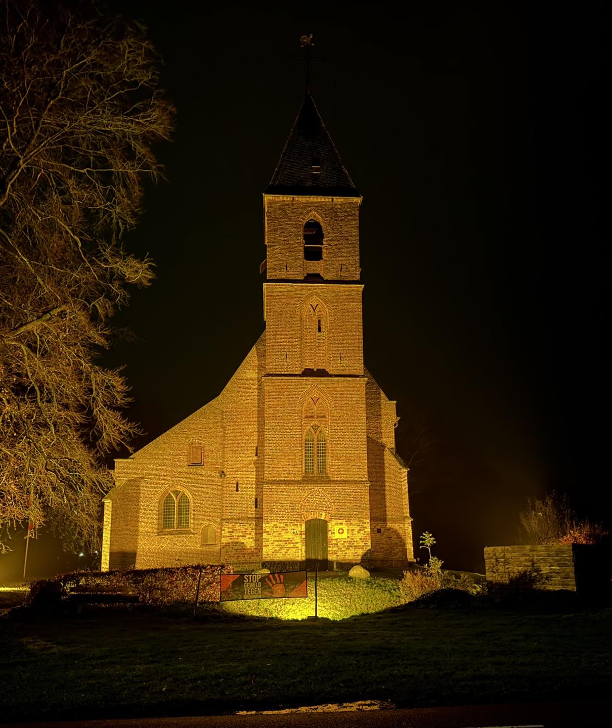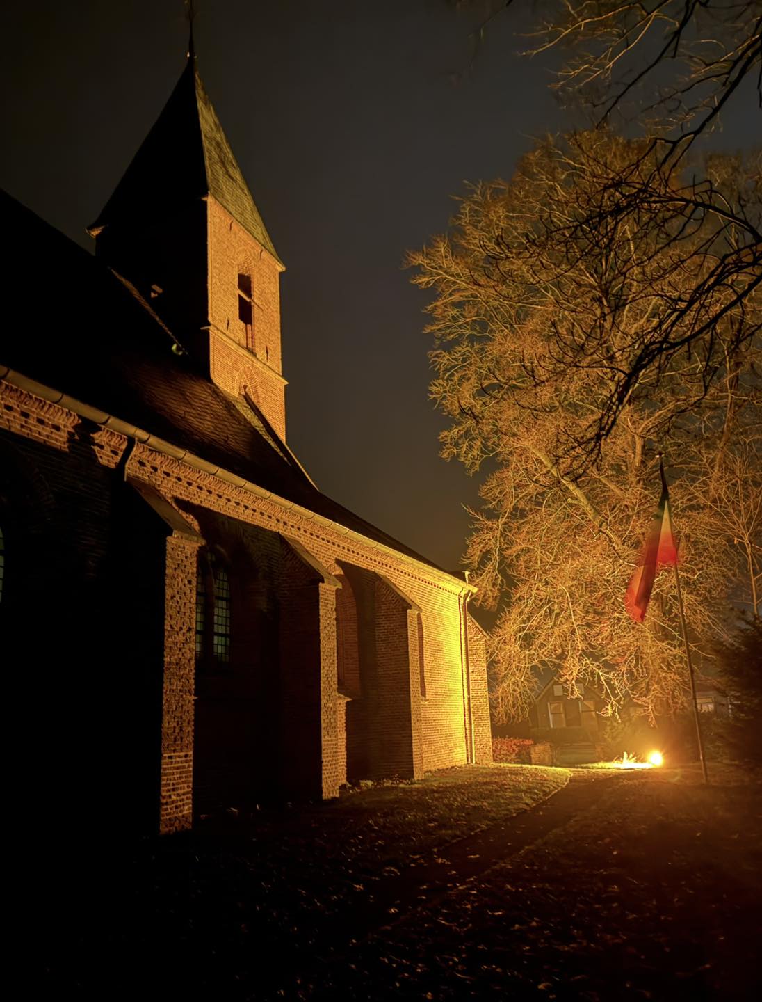 De kerkelijk erf is op deze avond verlicht met kaarsjes. De deur staat open.