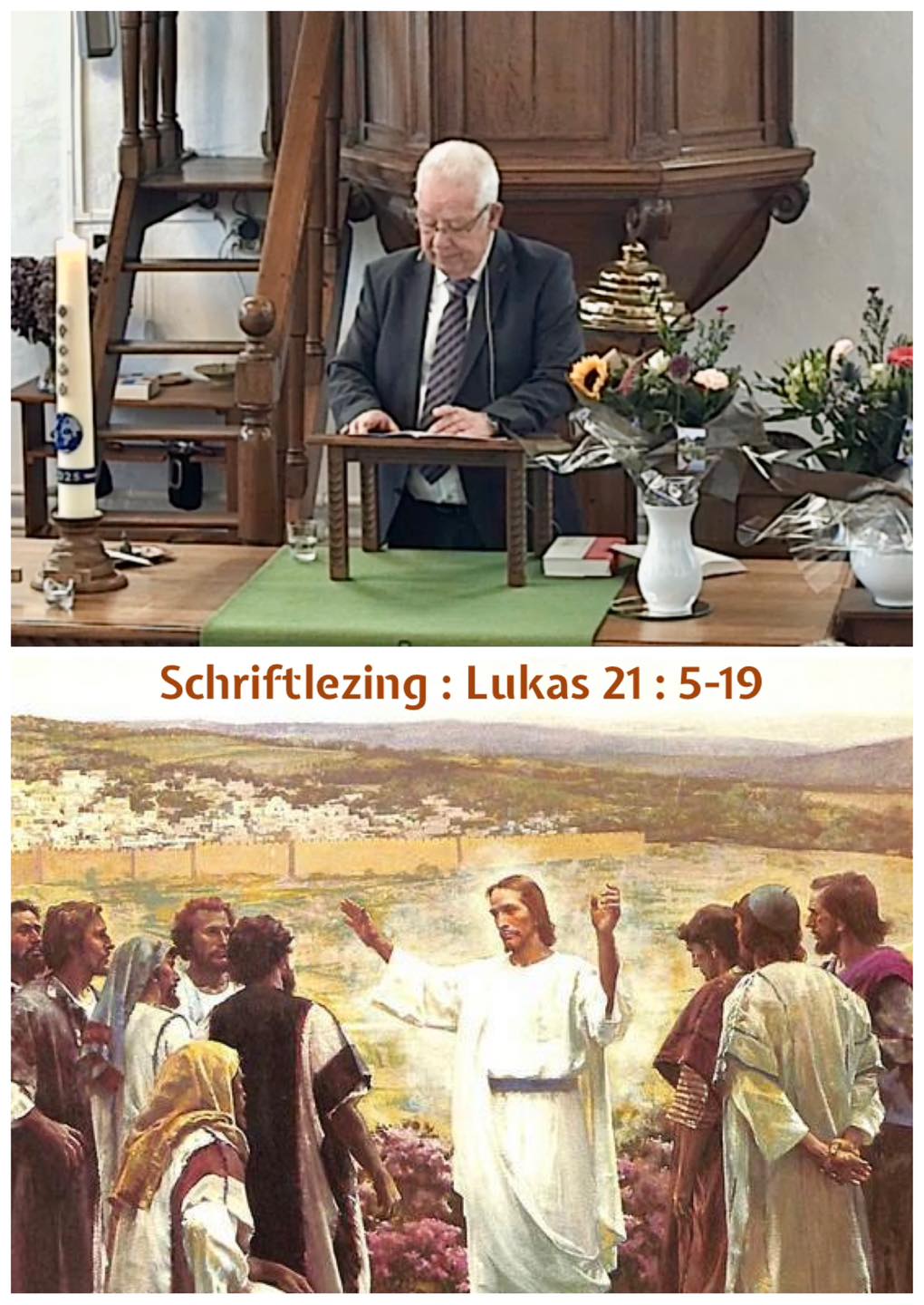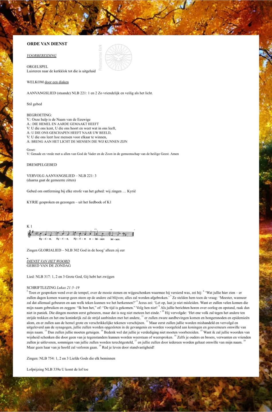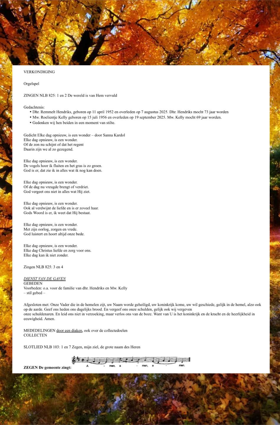 Organist Marjan de Noo. Welkom door Rudy van Goor. Ouderling van dienst Roelof Kuijer. Begroeting. In memoriam. Uitleg over de collecte. De zegen. Bloemen van deze week.