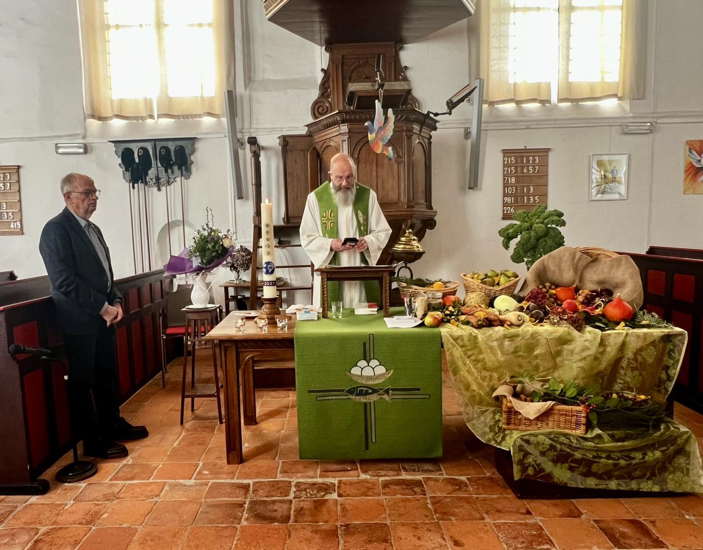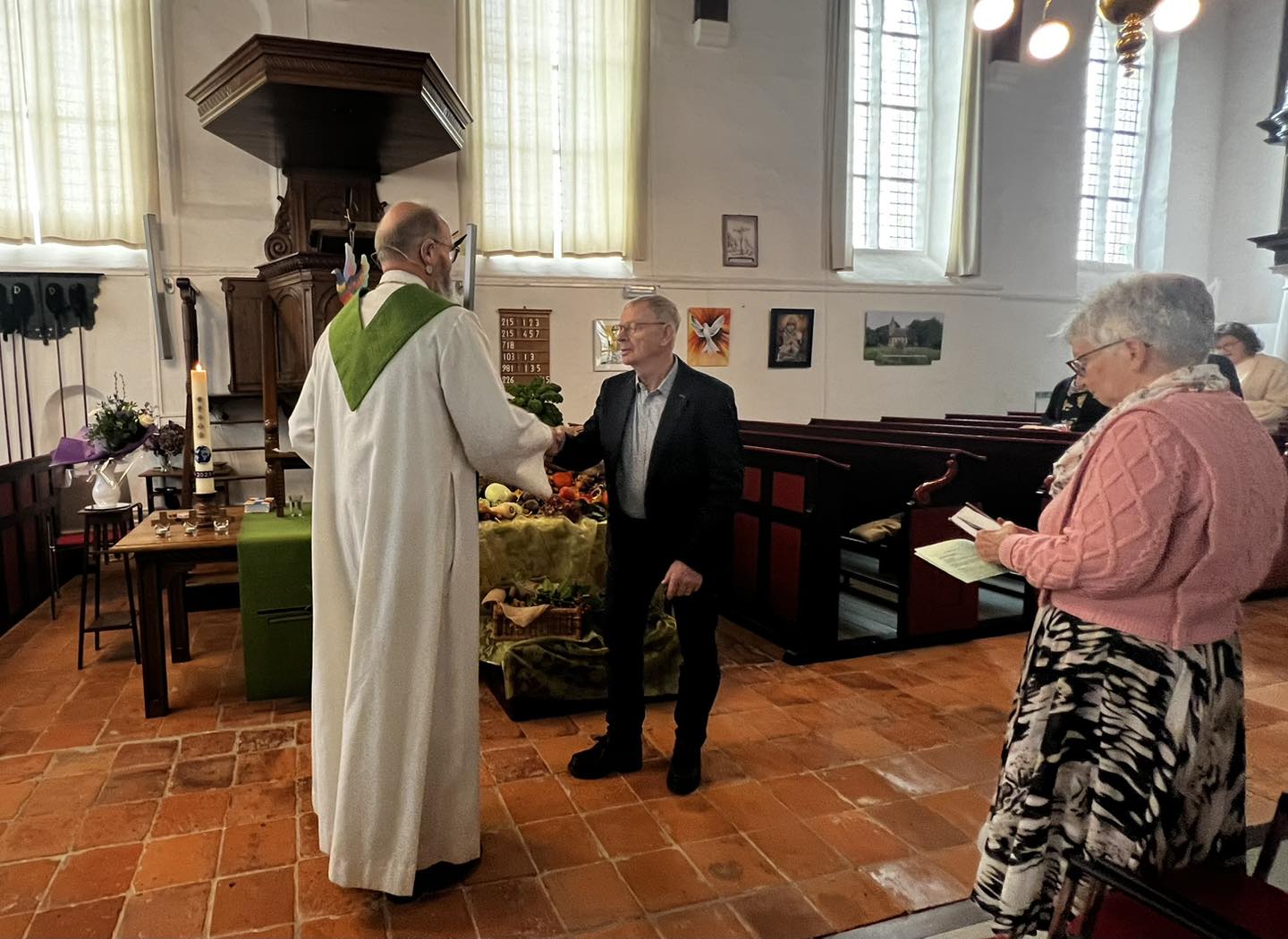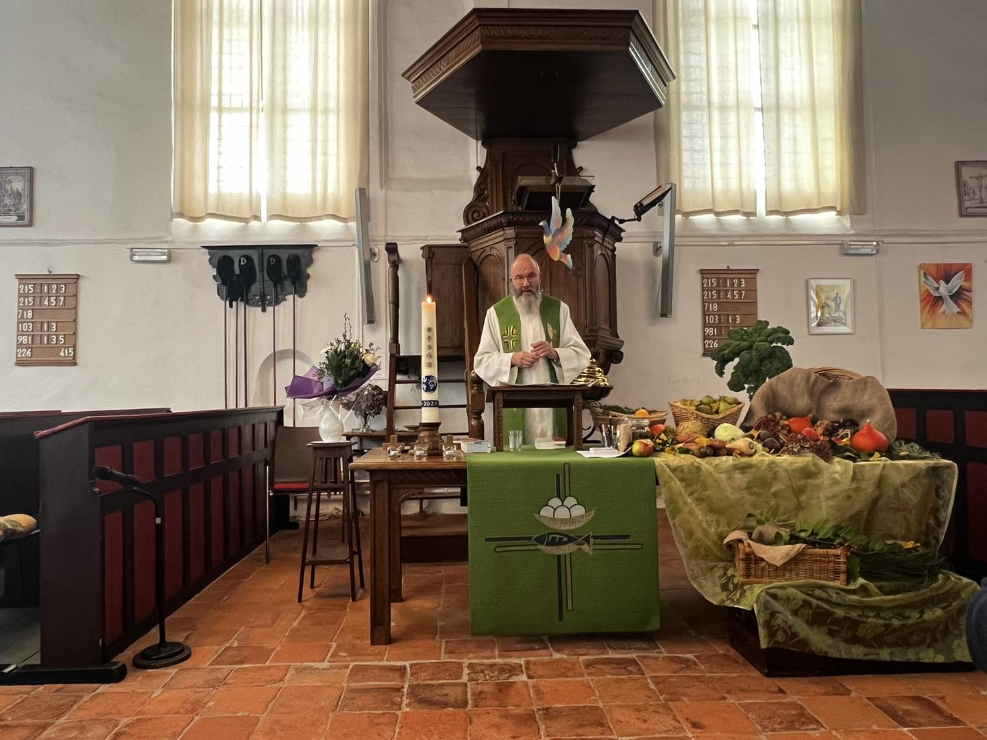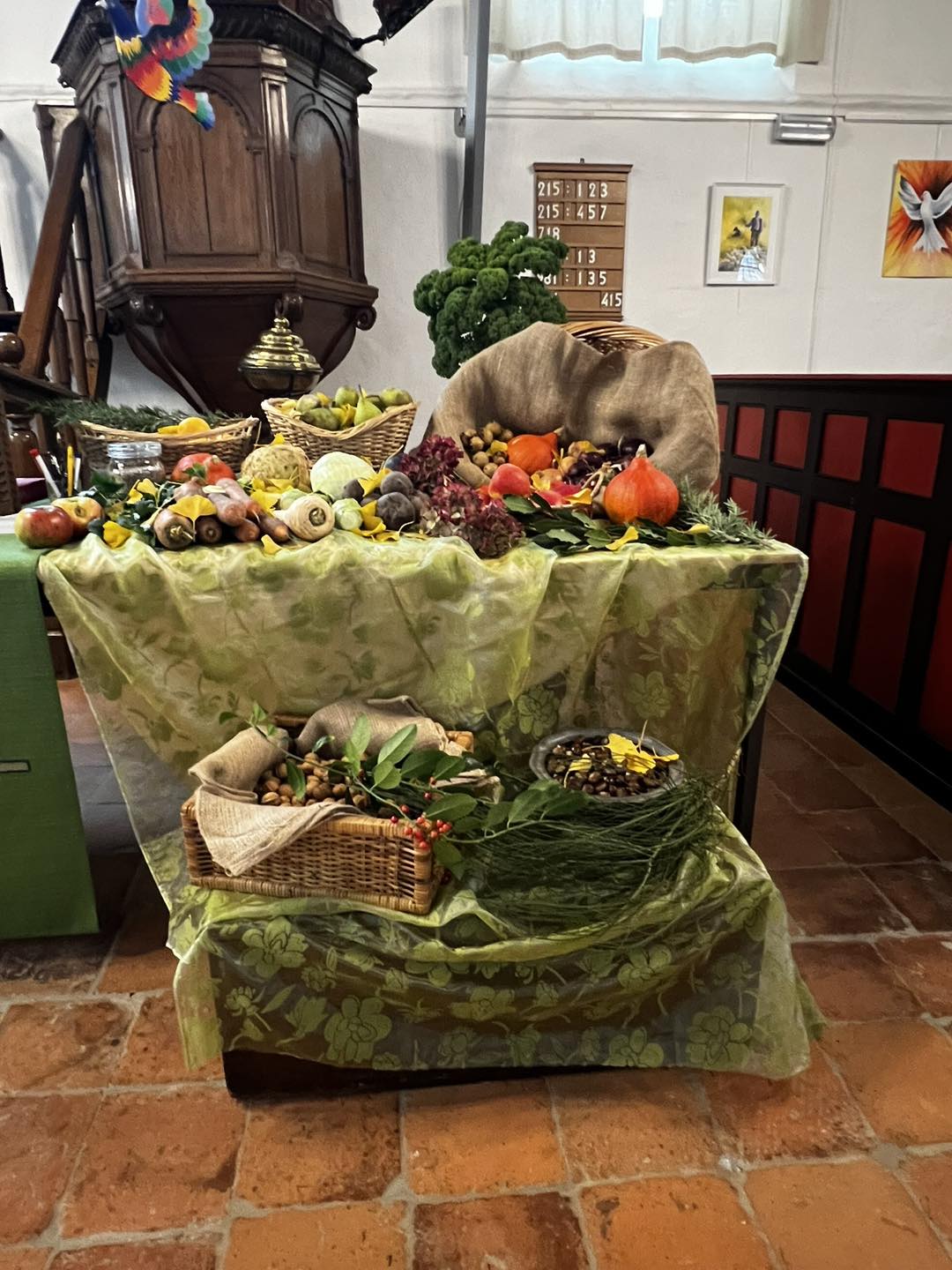 Dankdag voor het gewas en er is een prachtige tafel klaargemaakt met allerlei groenten en fruit uit de tuin van gemeenteleden,