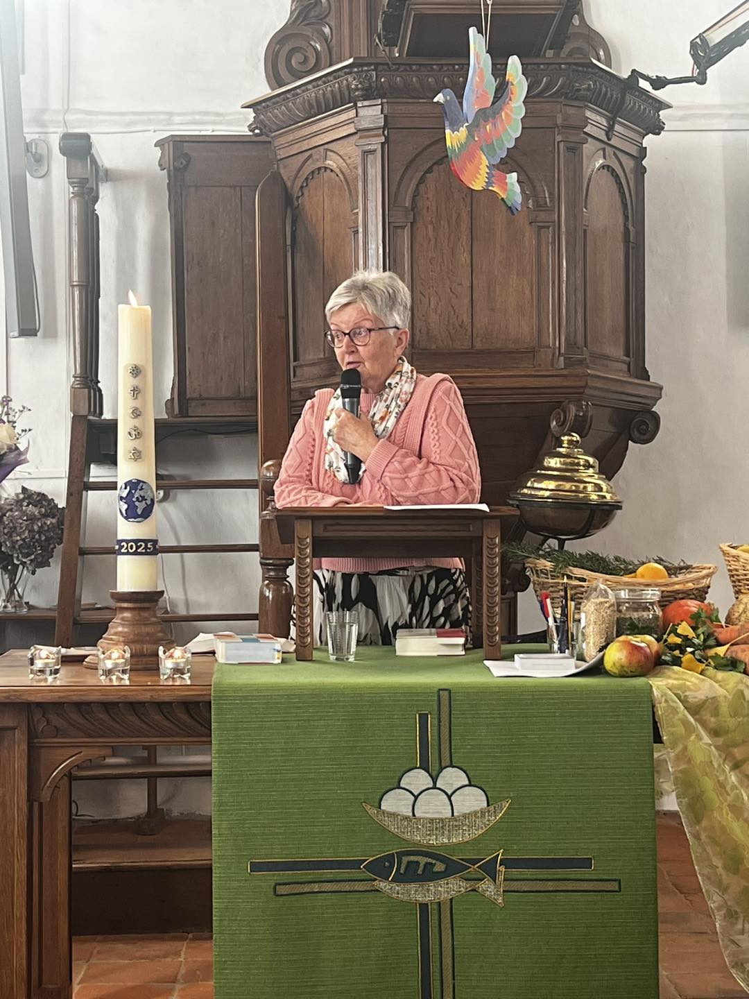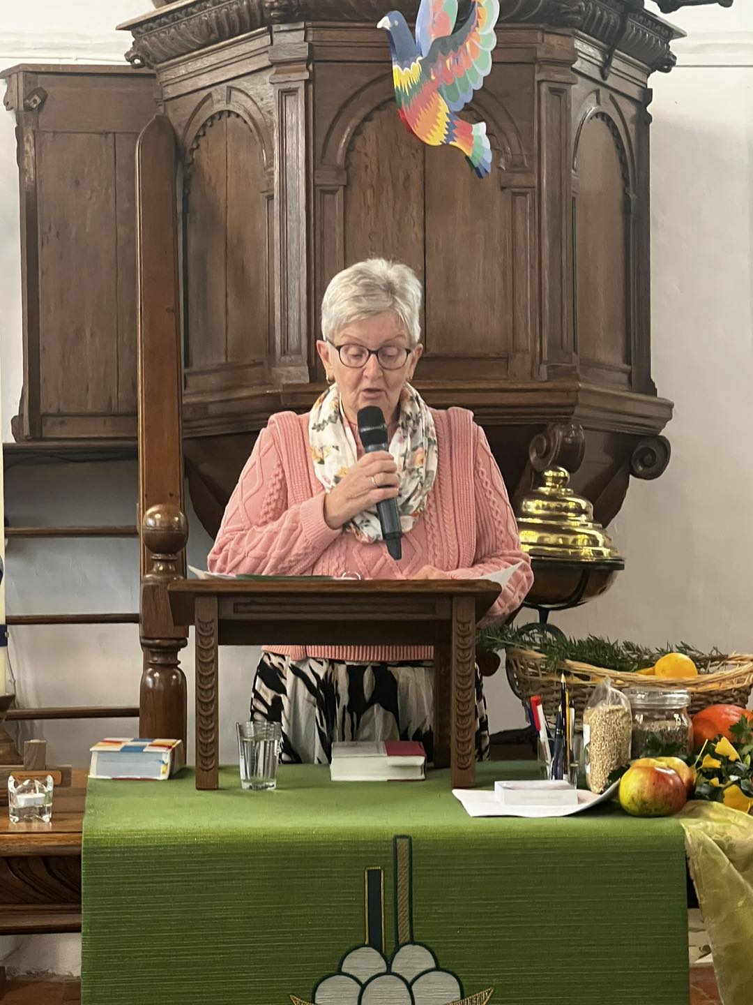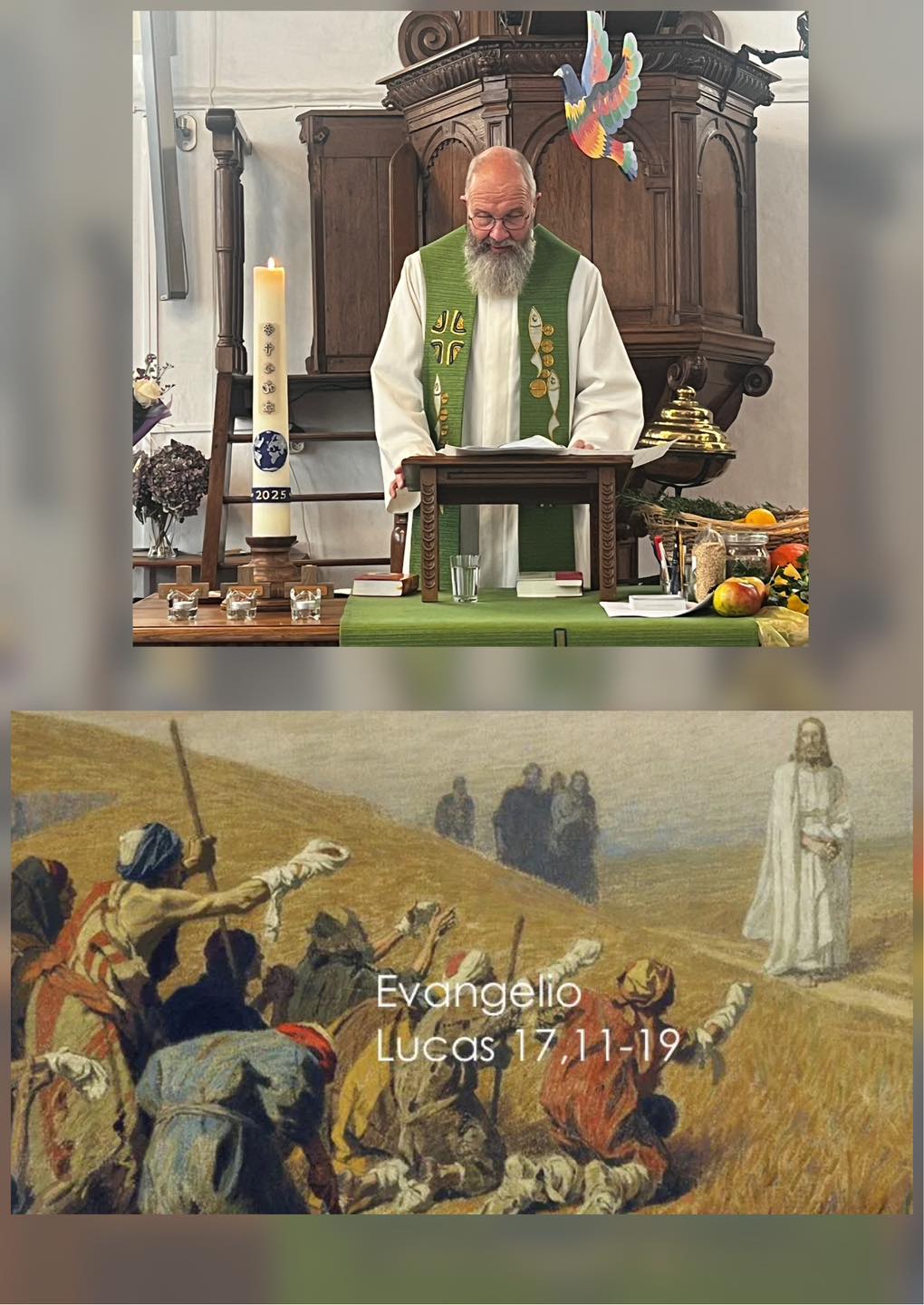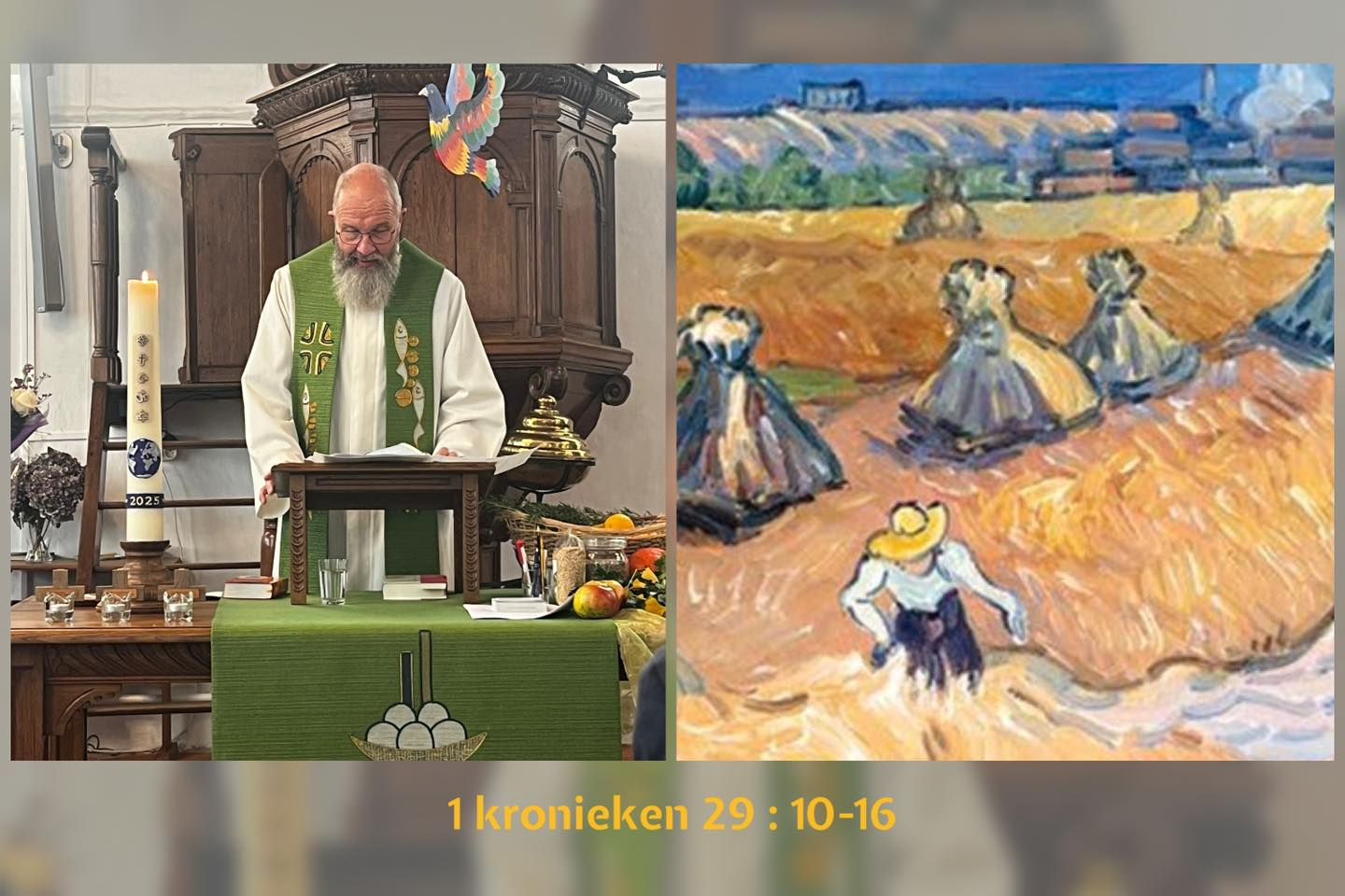 Dankdag voor het gewas en er is een prachtige tafel klaargemaakt met allerlei groenten en fruit uit de tuin van gemeenteleden,