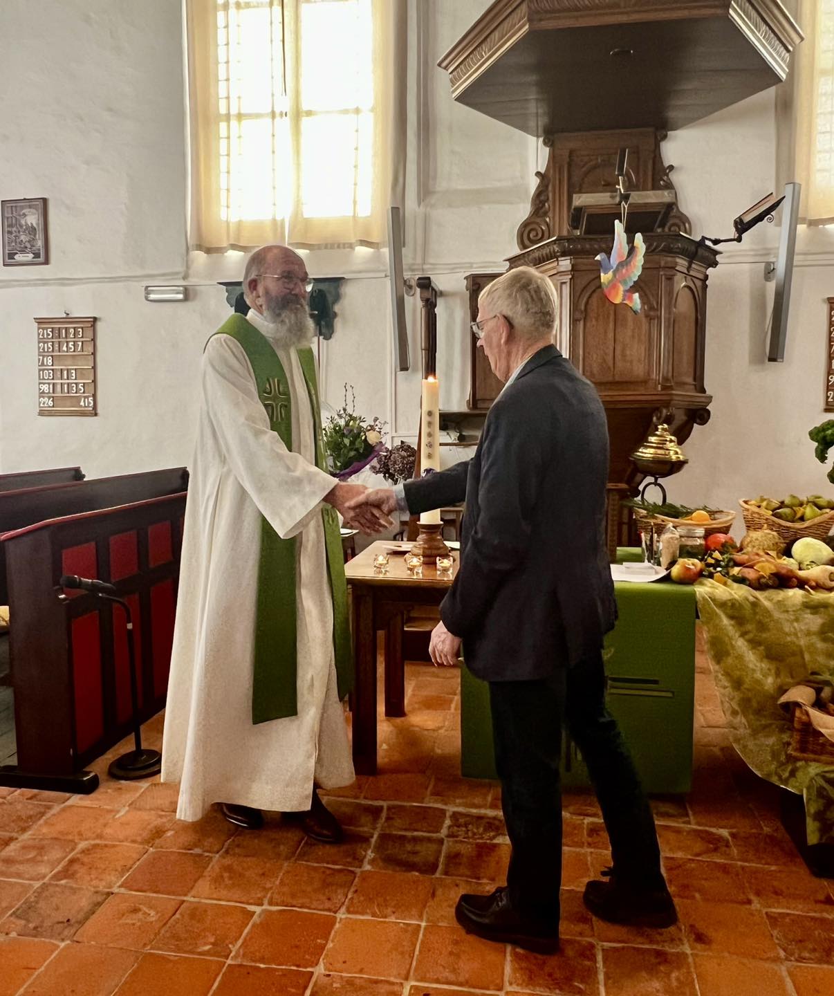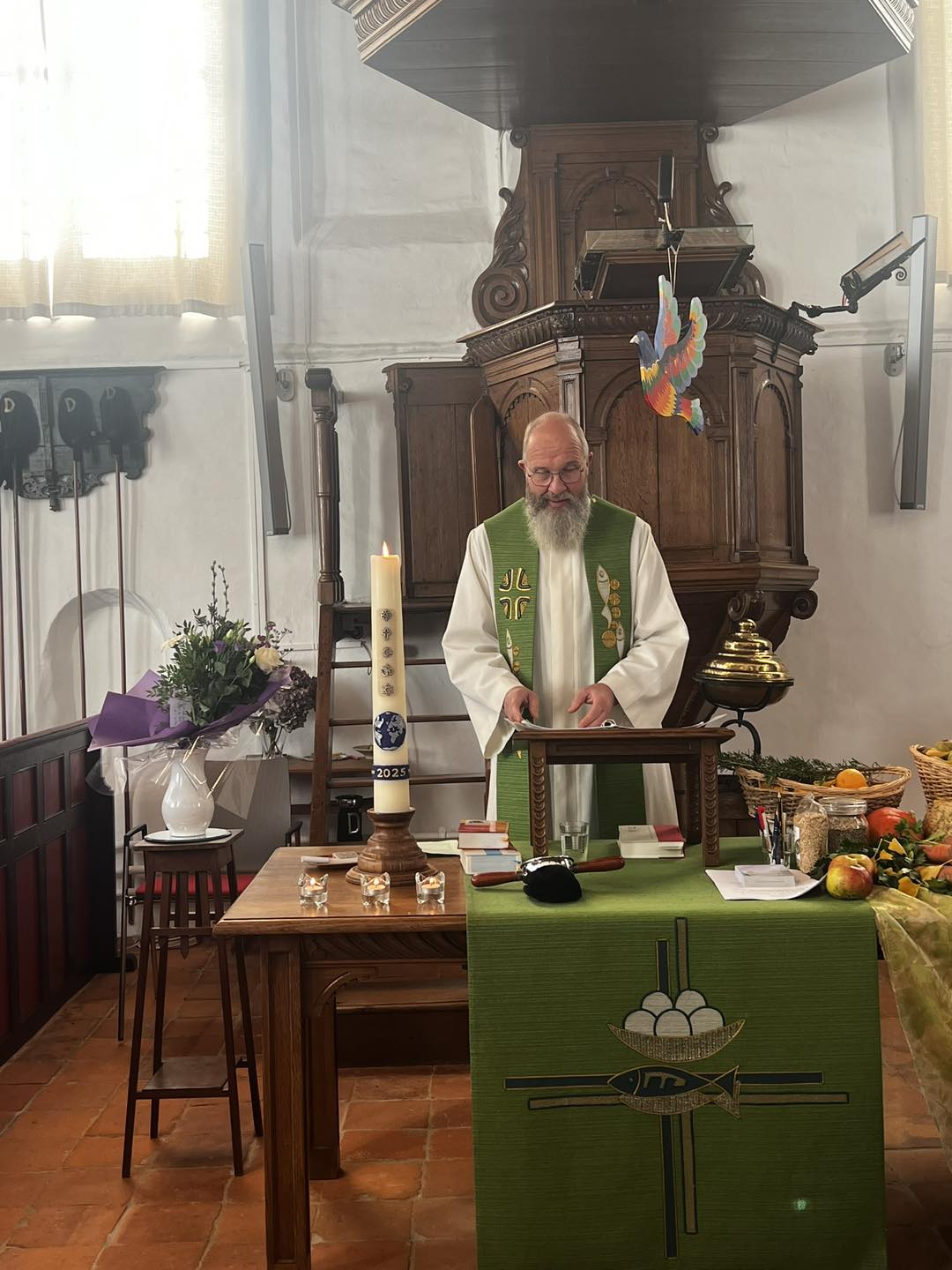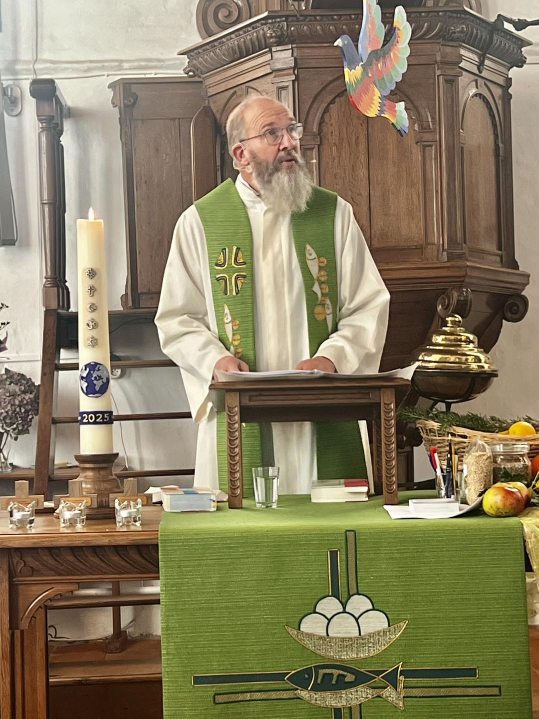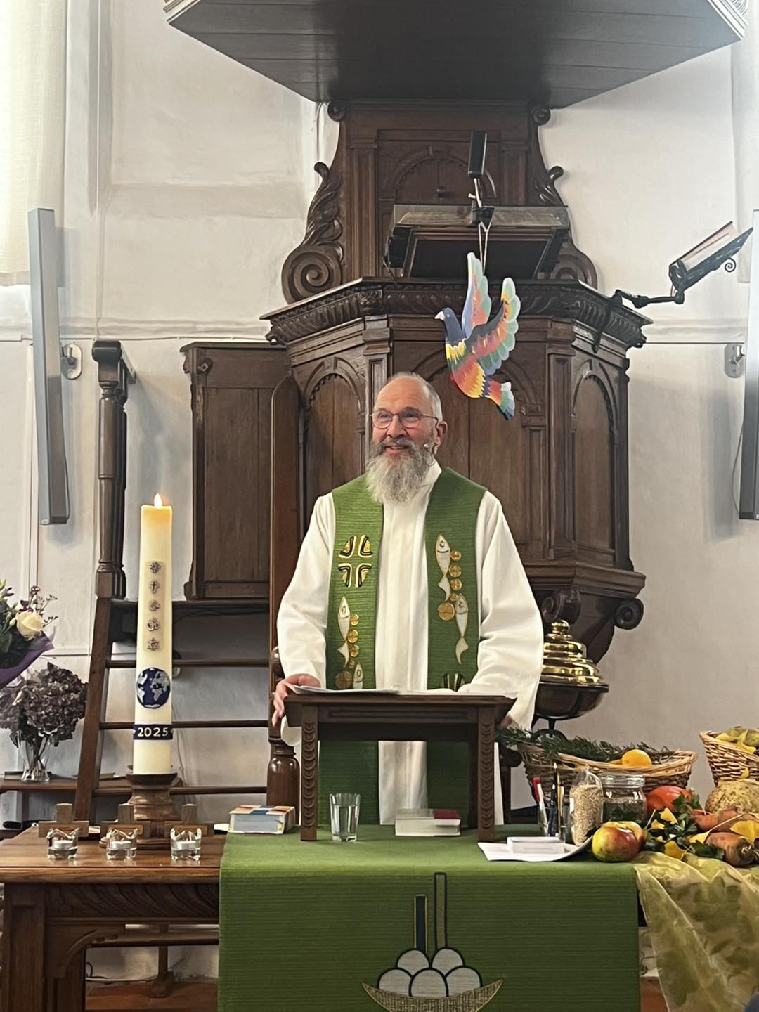 Dankdag voor het gewas en er is een prachtige tafel klaargemaakt met allerlei groenten en fruit uit de tuin van gemeenteleden,