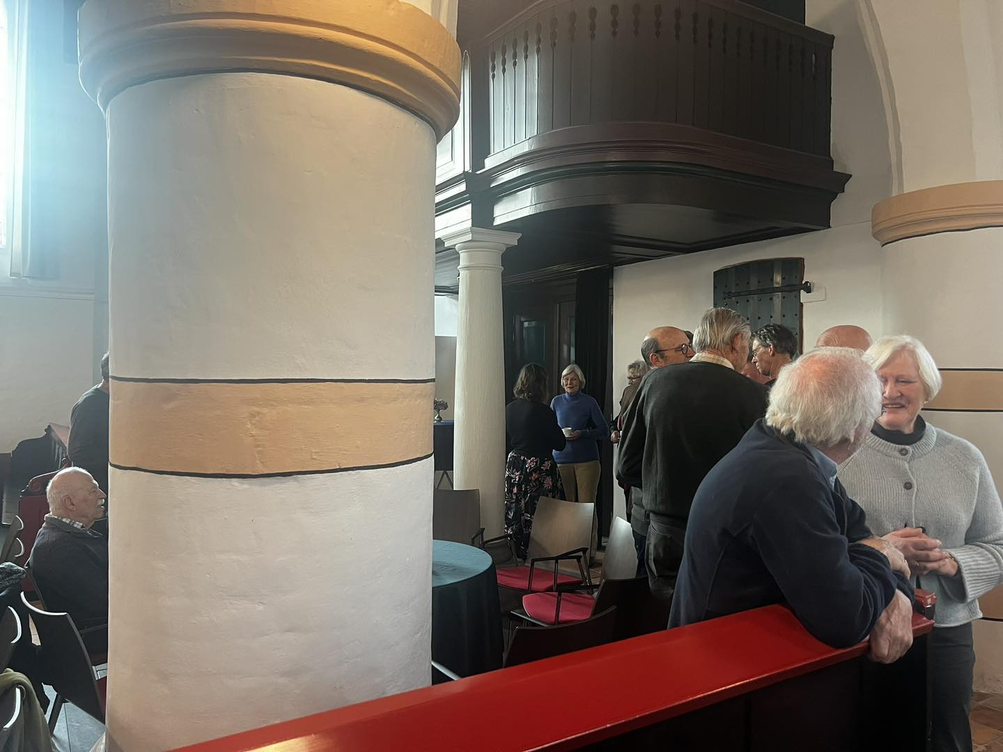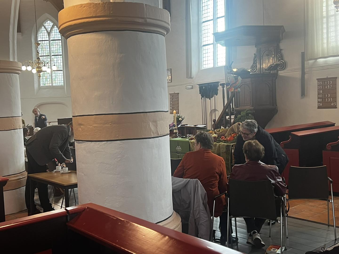 Gezellig met elkaar praten en koffie en thee drinken voor de dienst.