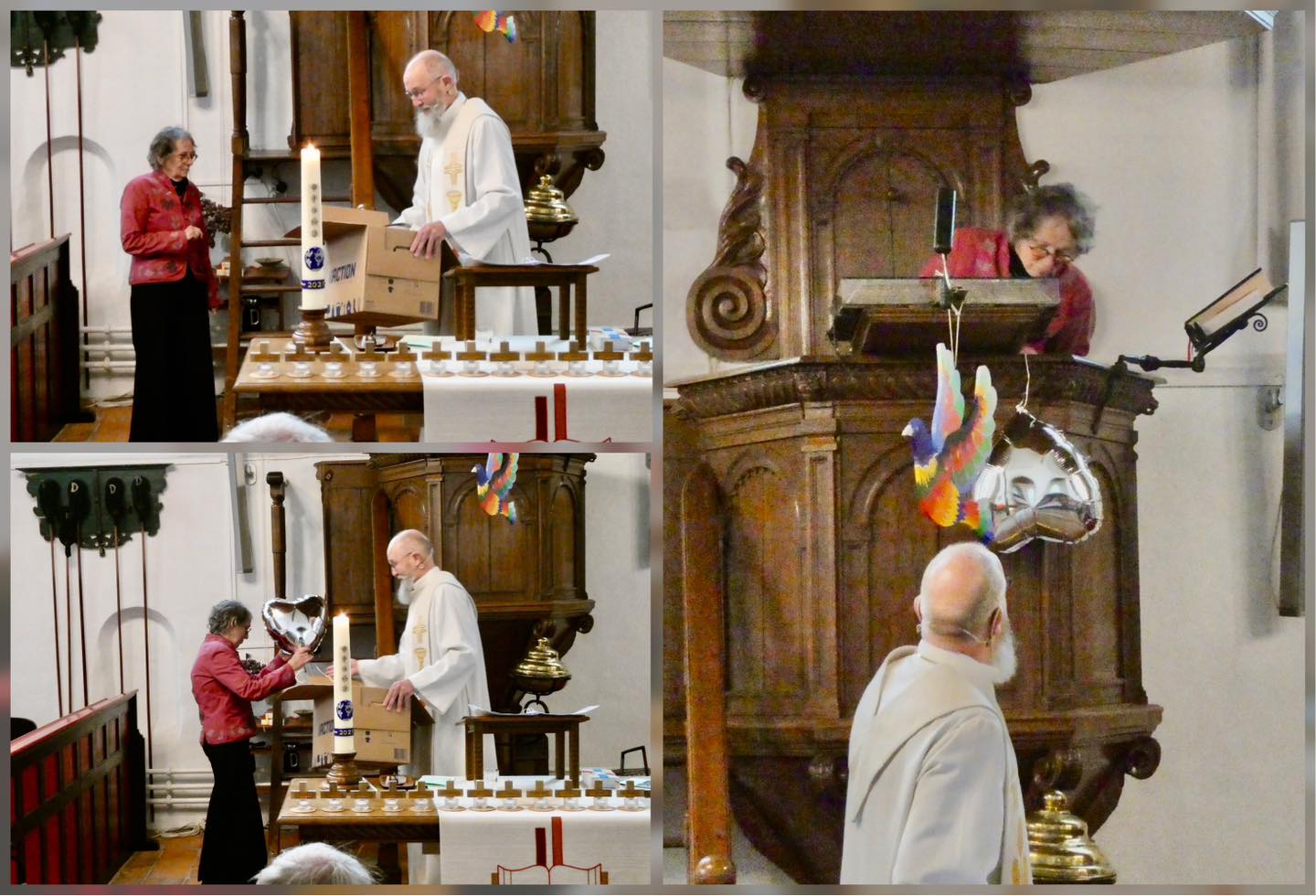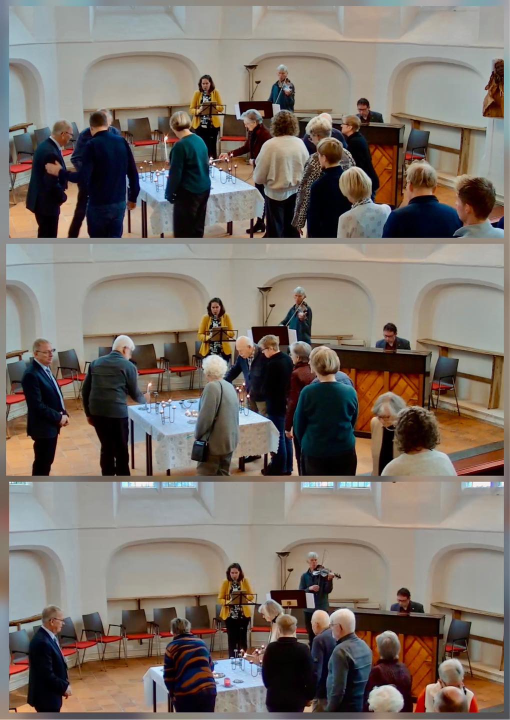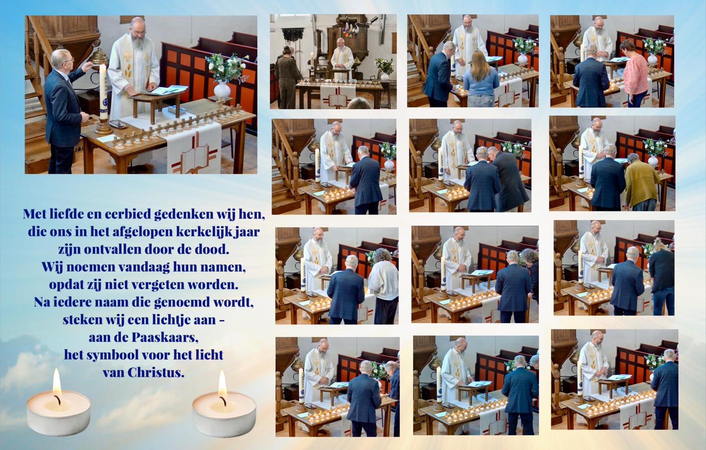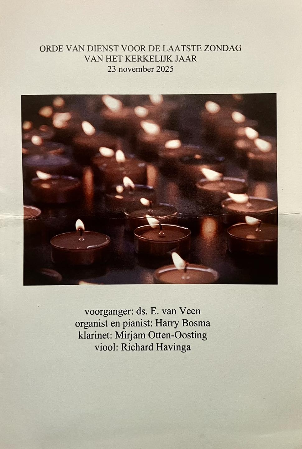 Liturgie. Prachtig spel van het gelegenheidstrio voorafgaand en tijdens de dienst. Welkom en mededelingen Marry Versteeg. Bemoediging en groet. Eerste schriftlezing. Tweede schriftlezing. Voor de overdenking kwam uit een doos een hartvormige ballon. De overdenking. Na de overdenking muziek. Inleiding van het gedenken van de overledenen. Daarna kon ieder die dat wilde een kaarsje aansteken. Organist en pianist Harry Bosma Klarinet Mirjam Oosting-Otten Viool Richard Havinga De zegen.