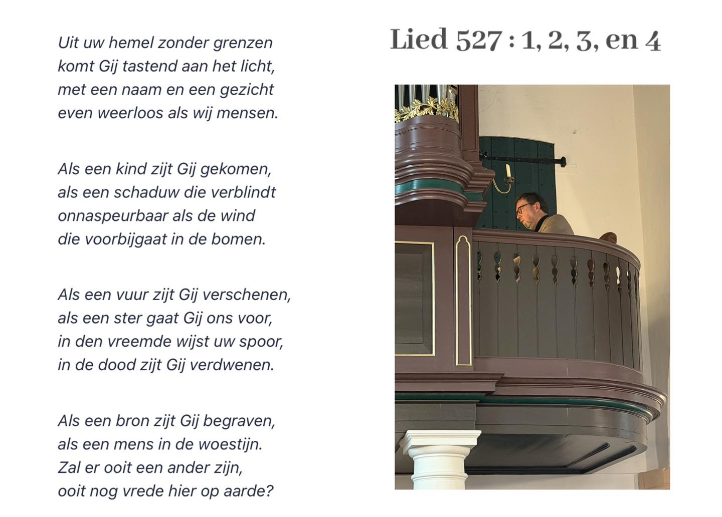 Liturgie Harry Bosma op het orgel. Welkom en mededelingen door Marie Versteeg. Begroeting. Collete doelen. Slotlied. Ouderling van dienst Willem Rumph De bloemen van deze week.