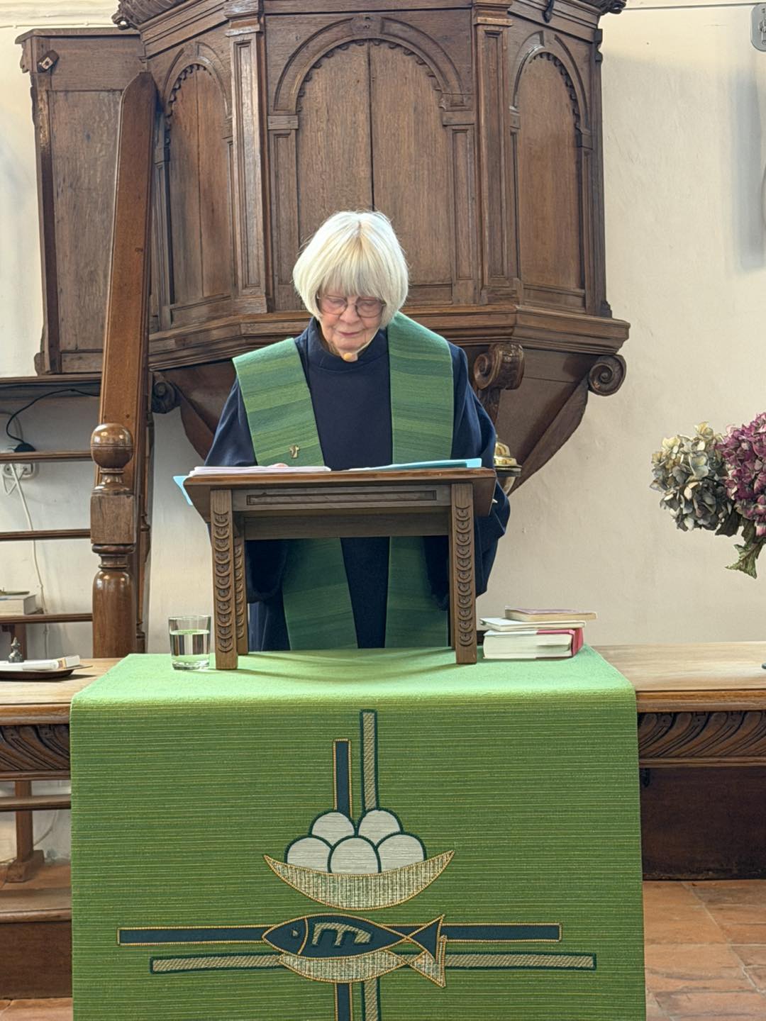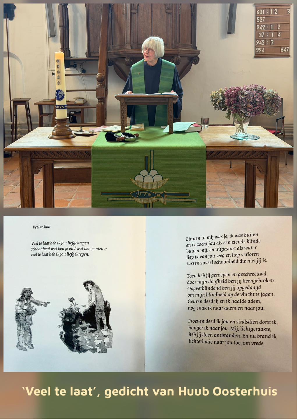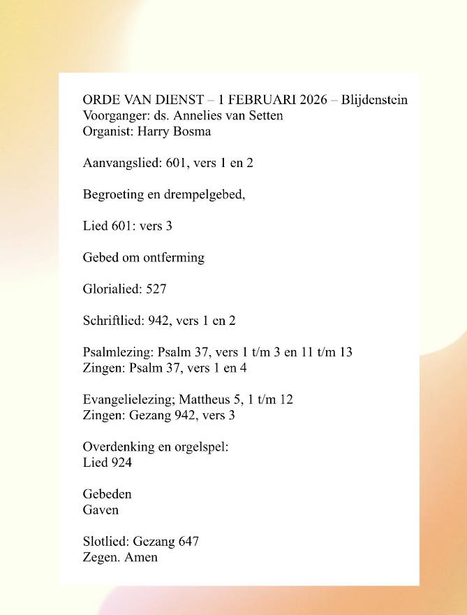 Voor de dienst kan een kaarsje aangestoken worden. Orde van dienst. Welkom en mededelingen door Anita Solis Guinto. Ouderling van dienst Jos Kramer-Kolleman. Een moment van stilte. Harry Bosma op het orgel. Glorialied : 527. Uitleg over de collectes. Na de dienst koffie/thee en ook even fijn met elkaar praten.