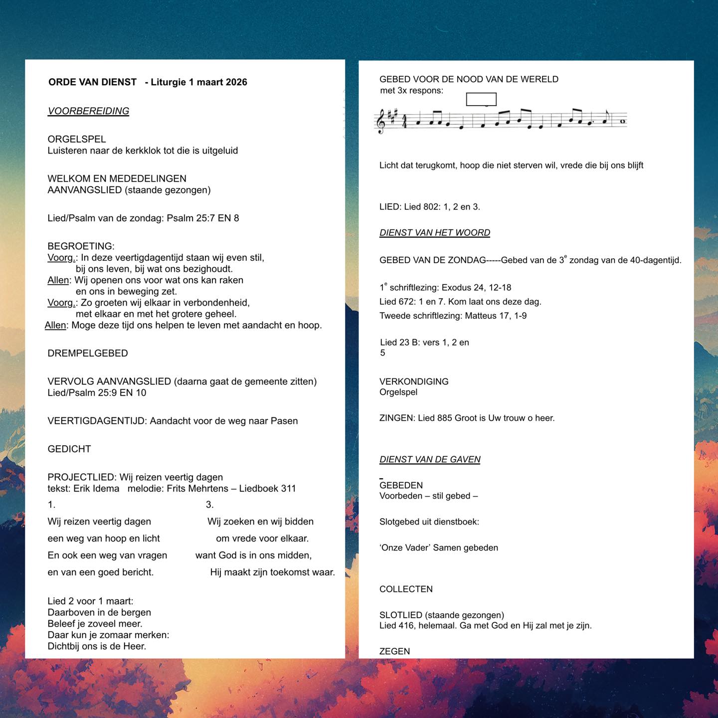 Welkom en mededelingen door Marie Versteeg. Ouderling van dienst Akkelien Zijlstra. Begroeting. VEERTIGDAGENTIJD : Aandacht voor de weg naar Pasen. Gedicht : Agnes Dei / Lam Gods. Harry Bosma op het orgel. Info over de collecte. Slotgebed. Afsluiting van de dienst. De bloemen van deze zondag.