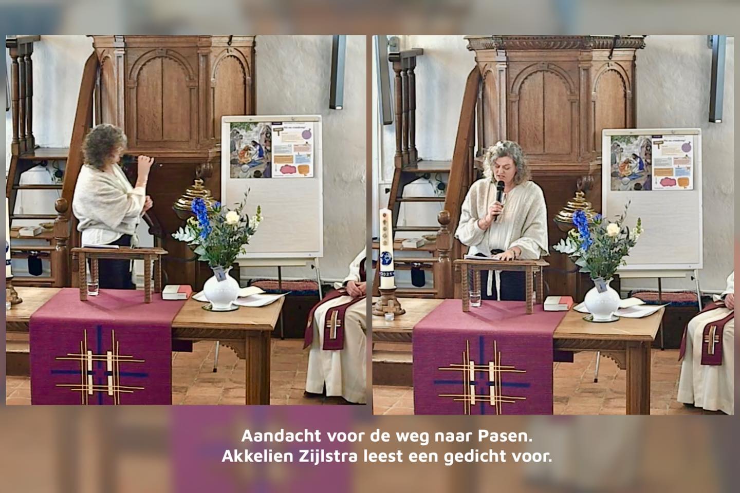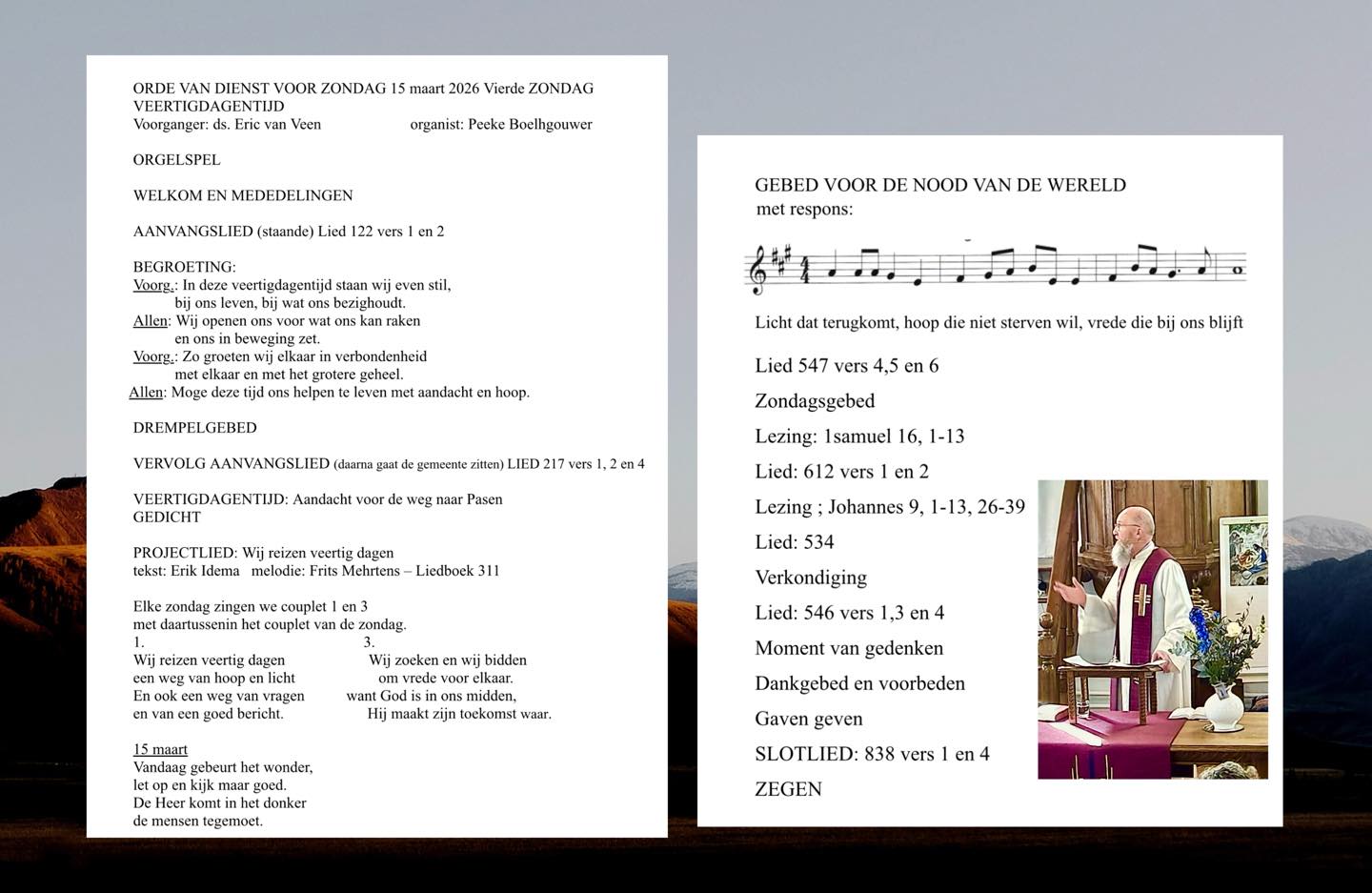 Het Aanvangslied. Organist Peeke Boelhouwer Welkom en mededelingen door Anita Solis Guinto Ouderling van dienst Akkelien Zijlstra Begroeting. Eerste lezing 1 Samuel 16 : 1-13. Tweede lezing. De Verkondiging. Uitleg over de collecte. De zegen. De bloemen van deze week.